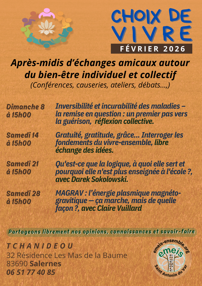 Dimanche 8 février 2026Inversibilité et incurabilité des maladies – la remise en question : un premier pas vers la guérison, réflexion collective. De point de